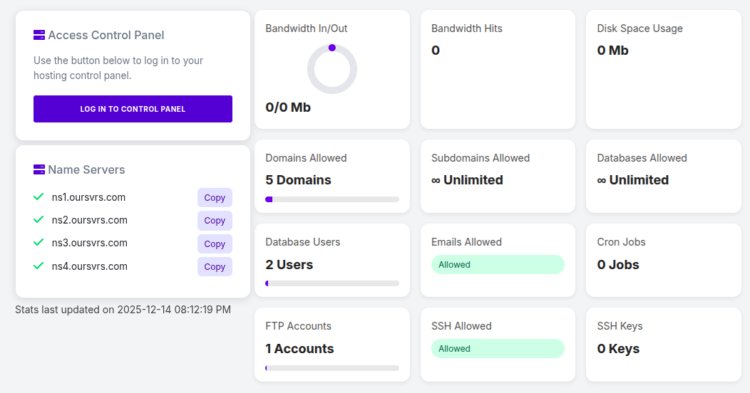 Test Connection Package Lists Create New Account Remove Account Suspend Account Unsuspend Account Change Password Change Package Client Area Template Admin Single Signon Client Single Signon Server Usage Update